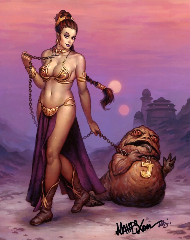 This is an older piece of artwork, but I stumbled upon it for the first time a few weeks ago and contacted UK-based artist Matt Dixon to see if I could get a print. It’s a clever concept. It sort of illustrates how Leia turned the tables on Jabba in the film, but this time she’s making him her pet (just as Jabba did to her) rather than strangling him. I like the “J” dog tag. 🙂