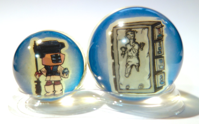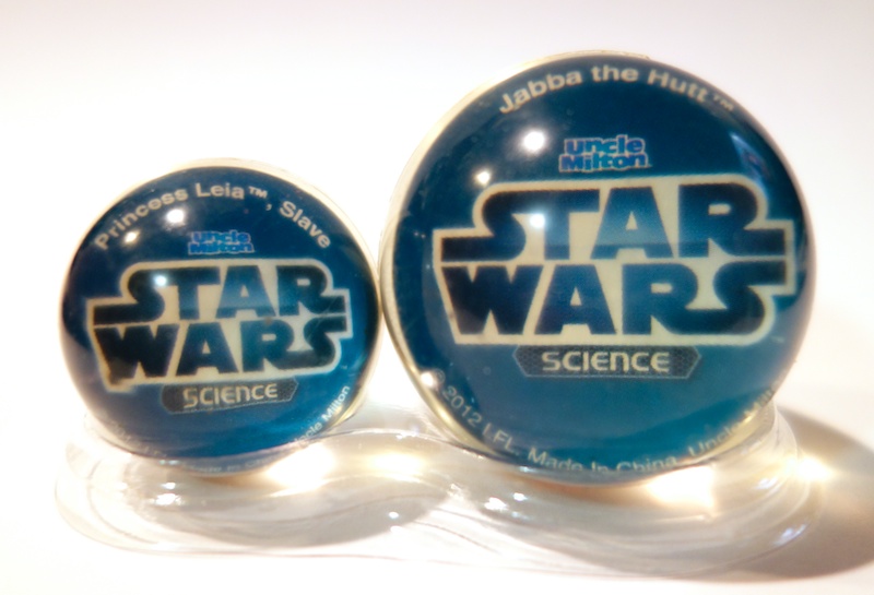 Each pack has one large and one small ball, with 12 different pairs to choose from. They’re sold under Uncle Milton’s “Star Wars Science” line, but to call these educational toys is a bit laughable. They’re just “super balls.” There’s a little clear plastic insert in the package that you can use to as a stand for your balls, so you can display them without them rolling all over the place. I thought that was a nice touch. These were originally $4.99 at TRU, but on clearance they ended up being a bit over $2 a pack, which isn’t too bad.
