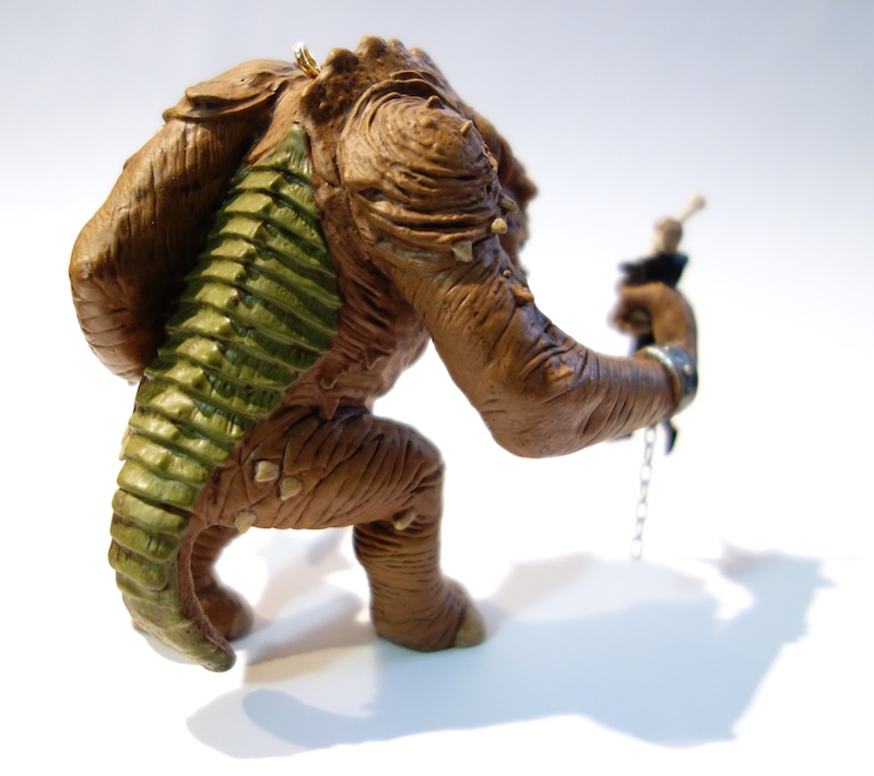 The ornament itself isn’t really bad, but the paint job is a bit basic — mostly just brown with a dark wash over the top. One thing I don’t understand is why they chose to make his tail a brownish-green color. That’s something I’ve never seen on any other rancor statue or figure. They did add a real metal chain to his shackle, which is a nice touch.
