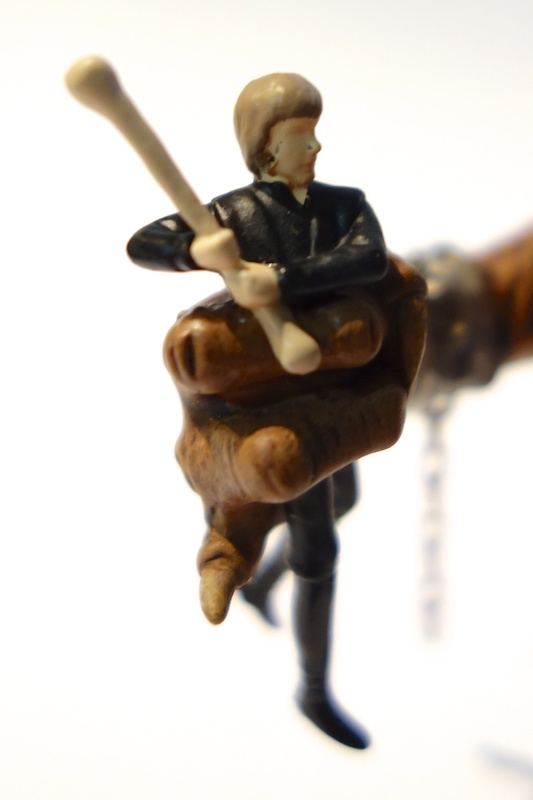 The entire ornament is around 4 inches tall, so Luke is quite small — maybe an inch tall. But even for being so small, he’s very simplistic indeed, with little detail in the sculpt and only broad swathes of color. Granted, it might actually have looked worse if they tried to fill in details like the eyes, but still I can’t help but feel that he looks unfinished.