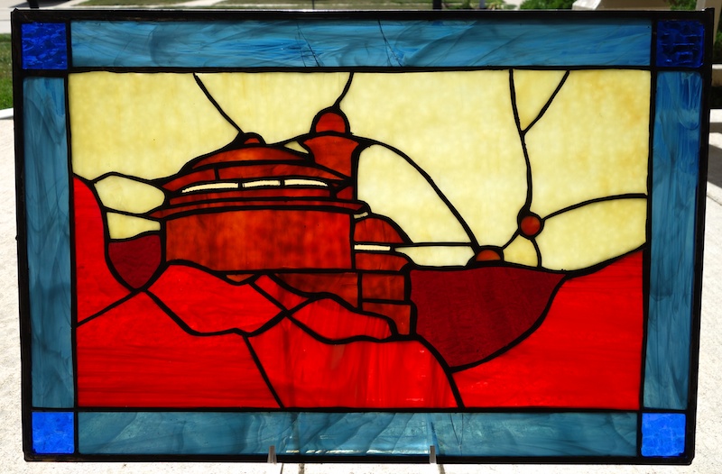 Almost exactly a year ago, I received a stained glass panel of Jabba the Hutt done by RussG, who does stained glass as a hobby. I told him at the time that I’d like to have another piece done sometime, and we finally got around to doing that just recently. Originally I was thinking of doing the Rebo Band, but I decided to go with Jabba’s Palace instead. I think Russ did a fantastic job. (Notice the twin suns on the right.) It’s quite a large panel, at around 12″ x 19″ (so it’s a bit bigger than the Jabba panel). It’s difficult to take pictures that really do it justice, but these give you some idea. In the shot above, I have it upright on a stand, which allows the sunlight to shine through it from the back.