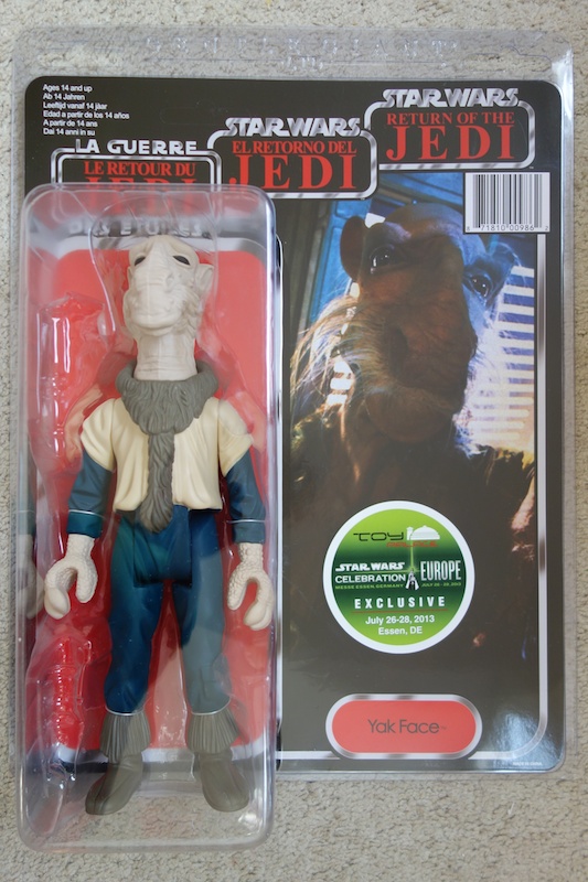 This version of Yak Face was exclusive to CEII (Celebration Europe II) and was sold by the German retailer Toy Palace. It features the “trilogo” card (with logos in three different languages) that was used on the rarer version of the vintage Yak Face figure. Aside from the difference in logos, the trilogo version uses red behind the figure and his name, while the “normal” version uses pink. And like the original trilogo Yak Face, it doesn’t come with a staff (although the plastic tray holding the figure in place does have a place for it). I did feel a little silly trying to explain to my wife how this was different from the figure I had just received earlier this month…