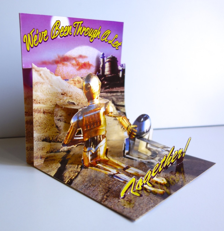 I posted about the “Jabba Birthday” card from PopShots a while ago. This one features the droids walking up to Jabba’s palace in the distance and has the message “We’ve Been Through A Lot Together!”