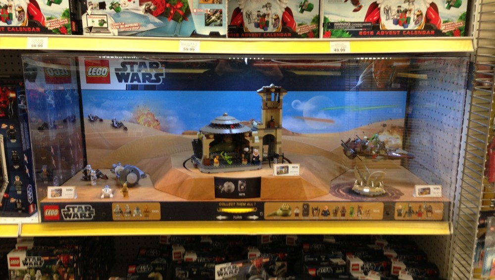 I first saw this particular type of display at a Chicago area Toys R Us back in January and I snapped a picture of it at the time (see below). None of the TRU stores in our area got these, so they may have only gone to stores in larger cities. I already had the models from an old Jabba’s sail barge store display, so I knew I had to try and get my hands on this one of these as well. It is for the Jabba’s Palace (9516), Desert Skiff (9496) and Droid Escape (9490) sets. It’s a little odd for them to include the Droid Escape set, since that’s from A New Hope and the rest are from Return of the Jedi. Ideally, it would have had the Rancor Pit (75005) instead, but that set wasn’t released until later.