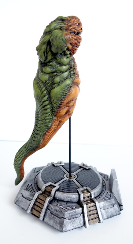 It took me a while to figure out how to make a stand for this, since the “kit” consists only of the resin casting of Jabba himself and no stand or rod to support him. After some digging around the house, I managed to find a metal rod that seemed perfect and a base from a Star Trek action figure that seemed like it would work (is that blasphemy?). I repainted the base so that it just looked vaguely futuristic. The main thing I needed was something broad enough that he wouldn’t tip over, but the idea I had in the back of my mind was that maybe Jabba was trapped in some sort of stasis cell.