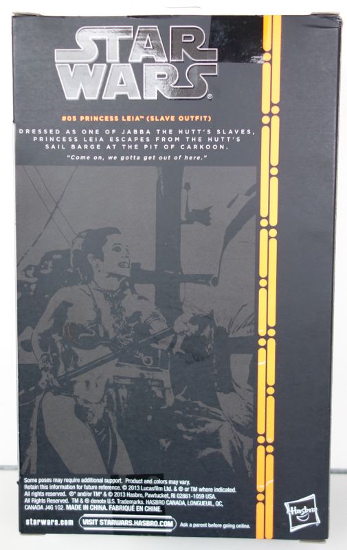 When I heard that Hasbro was releasing a Slave Leia figure as part of their new series of 6″ scale figures, I was intrigued. The prototype looked really good. But as is so often the case, a fair amount changed with the production figure. But I’m getting a bit ahead of myself. First, let’s look at the box. All of the 6″ Black Series figures have similar boxes, but I hadn’t looked at them closely until getting this one (my first in the series). I had the impression that they were all pretty much identical, but in reality there is a fair amount of custom artwork on both the front and back. (Technically the back is a photo but the point is that the box is more individualized for this figure than I first thought.) You also get a nice view of the figure itself.
