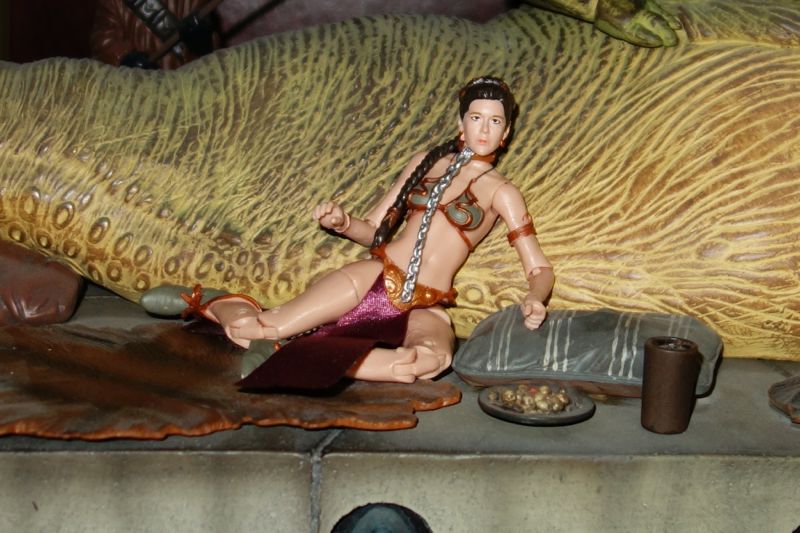 Articulation is always a problem with figures that are not wearing many clothes, and here it does look a little ugly to see all these joints. Most of the previous Slave Leia figures have eschewed super-articulated bodies for ones that look more attractive, but of course that means that Leia isn’t even able to sit down. Since one of the main uses for a Slave Leia figure is sitting by Jabba, that’s a problem. The Saga Collection Slave Leia solved this by including two pairs of legs — one for standing or other poses, and one for sitting. In this case, the figure is well articulated enough that you can in fact get her to sit down next to Jabba, although it’s still a little tricky. (TheFwoosh has posted a gallery with a lot of action shots of this figure to give you an idea of what’s possible.)