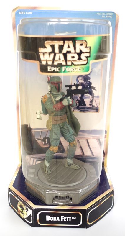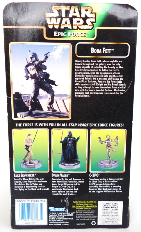 The Epic Force line was a line of large non-poseable figures (plastic statues, really) that Hasbro released in 1997. Size-wise, they’re pretty close to the new Black Series of 6″ figures, although a little smaller. Comparing this figure to the 6″ Black Series Boba Fett shows how far figures have come since then. Despite being a fully articulated figure, the Black Series version is much more detailed in its sculpt and paint work. Still, I suppose it’s not entirely fair to make that kind of comparison, so I’ll confine my observations to this version.