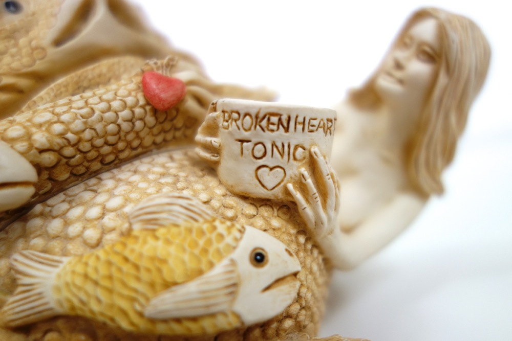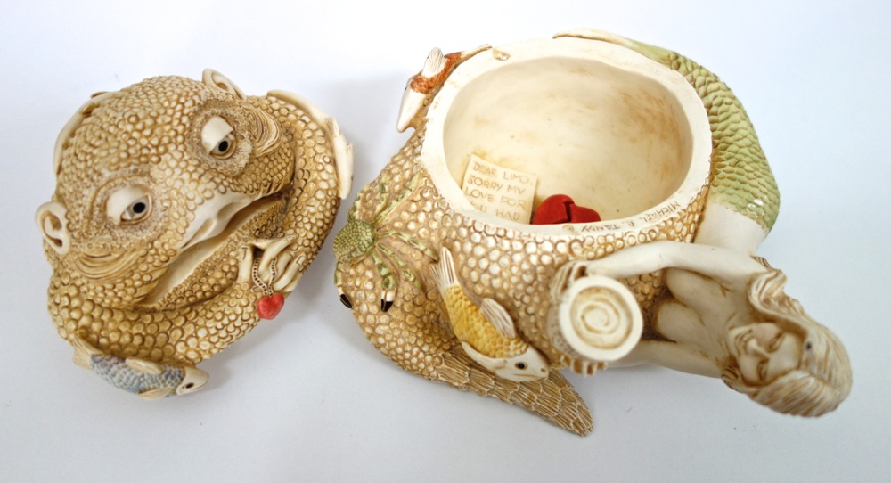 It’s possible the character of Jabba was just a subconscious influence on the artist, or perhaps the resemblance is entirely in my mind. “Jabba” in this case appears to be an undersea creature of some sort who has been dumped by his sweetheart. A mermaid is attempting to comfort him with some “broken heart tonic.” She gives me a little bit of a “Slave Leia” vibe as well. It’s about 3.75″ tall by 5″ wide, and fairly heavy — I understand it was made using a mixture of crushed marble and resin to achieve a kind of faux ivory look.