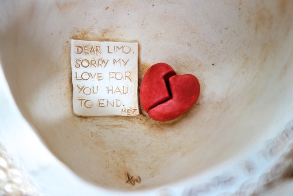 If you lift the lid (consisting of the creature’s head and upper torso) off, you’ll see his broken heart inside, along with a note from his beloved reading, “Dear Limo, Sorry my love for you had to end, Mez.” I’m not sure if there was any more detailed story that went along with it, or if were just supposed to fill in the blanks with our imaginations.