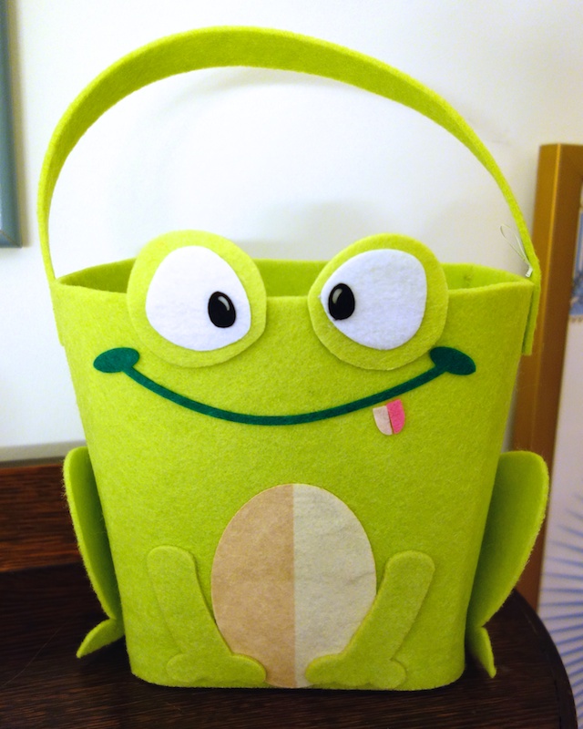 I apologize for the lack of updates recently, but here’s something I put together for Easter. I found some frog Easter baskets ($3 apiece at Target) that seemed like they would be easy to convert to Jabba. They’re made of thick felt and the facial features are also felt pieces glued to the surface. Basically, I removed and rearranged the felt pieces to make the frog into Jabba, although I did add a few pieces of my own felt for the eyes and orange stomach. The tail is a section of a second basket that I hot glued to the side. Pretty simple in the end, but I thought it came out okay.