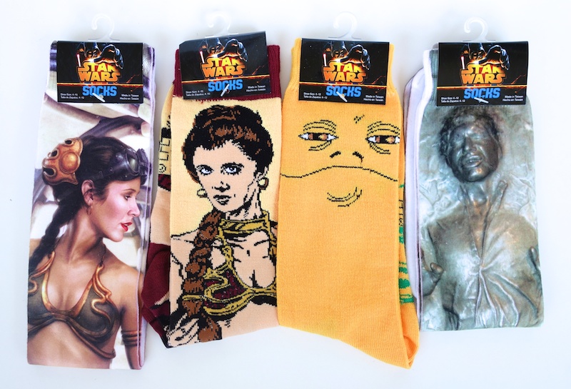 I’ve posted about my vintage Jabba the Hutt and Gamorrean Guard sweat socks before, but until now they were the only Jabba-related socks I knew of (assuming you don’t count the Mick Jabba socks). So I was surprised to find out about these socks recently. They’re part of a new line of realistic and knitted designs that features lots of different Star Wars characters. The two Slave Leia designs are apparently women’s socks, while the other two are men’s, although the difference is really in the sizing.
