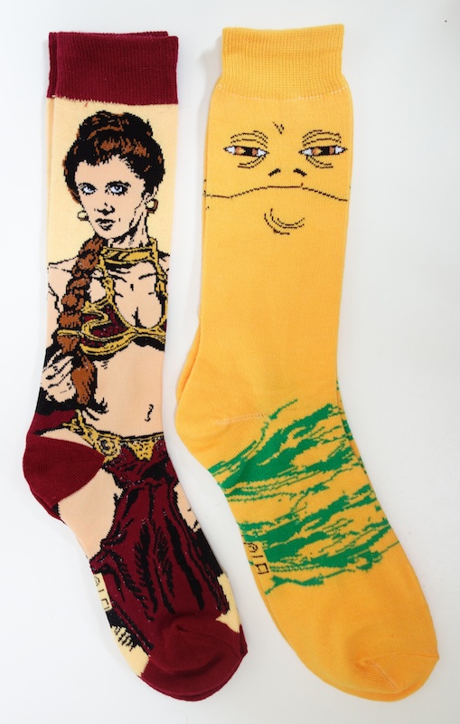 The socks on the left above use artwork from the Chris Trevas Celebration IV print titled “His Vision Returns.” It’s a fantastic print and looks surprisingly good on the sock, but cropping just the Leia portion of it seems to be a questionable decision. First of all, it eliminates the whole point of the print, which is showing how Han reacts to Leia’s outfit as his vision returns after their escape from Jabba. And even if you want to just use it as a standalone image of Slave Leia, having her wear goggles doesn’t make a lot of sense (in the original painting they were escaping a dust storm that was shown in a deleted scene from Return of the Jedi). I’m not sure if the Han in Carbonite is a photo of the actual prop or a painting of some sort, but it looks pretty good.