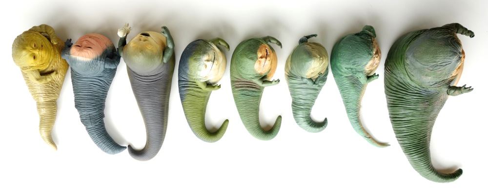 Here’s a shot of all of the Jabba figures that Kenner and Hasbro have put out over the years. He’s definitely quite a bit larger than the others (as he should be). He dwarfs the Walmart-exclusive Vintage Collection Jabba from 2010, and his body is also a lot taller, showing just how squished down that version really was (I had to add stuffing when making my repainted version to help correct this).