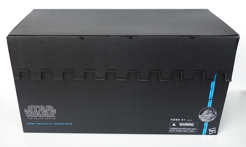 As you can see, Jabba is not only held in place by some paper cords, he also has his tail inserted into some clear plastic that’s attached to the cardboard throne. If you’re careful, it’s possible to get him out without destroying the packaging, although you do need to cut some cords and clear rubber bands. Below you can see the inside of the packaging taken out of the black outer box. They printed the throne graphic on both the inside and outside.