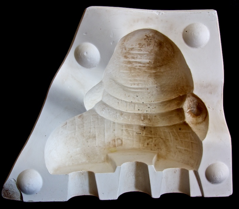 That’s why I was very excited when someone kindly pointed me toward an eBay listing for what appeared to be a mold for these figures. Plus, it was only $7. π I was pretty sure it was the mold for these figures, but when I got it in hand I had no doubt. As you can see, mine fits perfectly into the mold. I have no idea how many of these molds were made, but I can’t imagine that very many of them have survived. It’s a two-part mold made of a chalky white plaster. As you can see below,Β when you would actually use the mold, it would be upside-down so that the three holes are on the top, and the ceramic “slip” would be poured in there.
