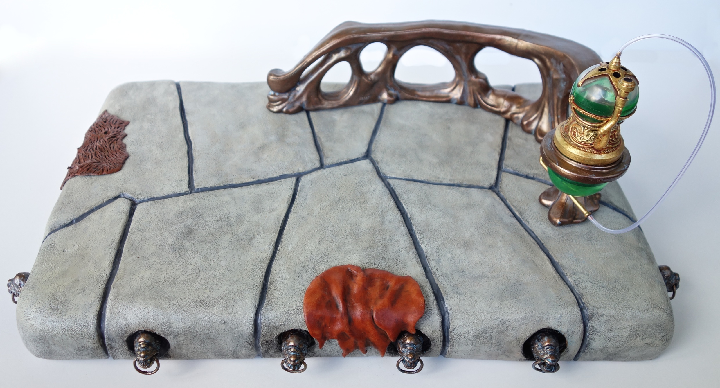 I sculpted the throne from Sculpey on top of a wooden base that I put together out of wood scraps, with a number of nails pounded in it to give the Sculpey something to grab onto. I knew that sculpting the throne out of a solid block of modeling clay would not be a good idea, and I experimented a bit using things like aluminum foil as the base without any luck. So this was my solution. It did end up working pretty well, although it’s rather heavy.