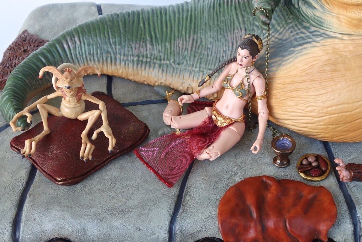 I sculpted some accessories like pillows, an animal skin, a piece of cloth (not pictured), a food plate and cup, and finally a little rat-slug creature. I’m not sure what this one’s called, but he was included in Sideshow’s Salacious Crumb Creature Pack. The ones in green were made from epoxy putty, while the tan pillow and piece of cloth were made using Super Sculpey.
