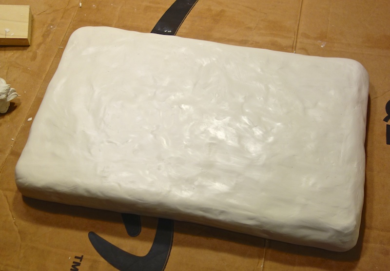 First I spread the Sculpey over the wooden base. It was pretty difficult to get it even. This was the best I could do, but I noticed afterward that the edges were more rounded than they probably should be.