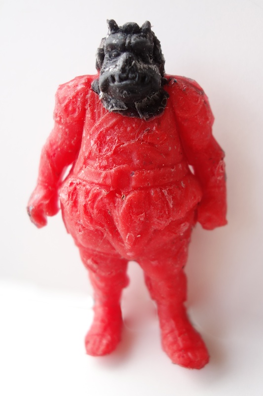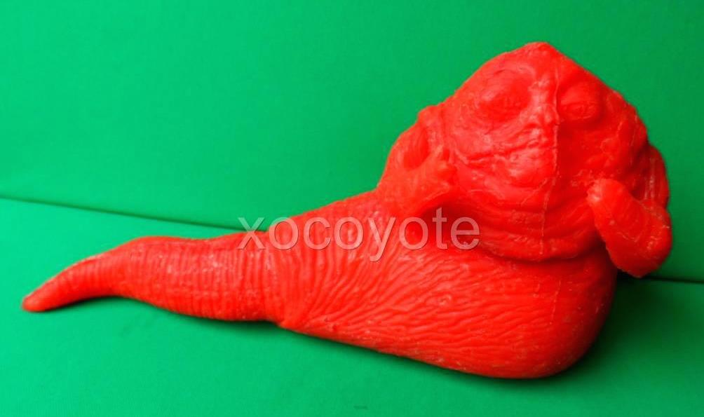 I’ve seen a fair number of these made of regular Kenner figures, but I had never seen a Jabba before. I had always figured that this was because the vintage Jabba figure was both too big and too common to make bootlegging worthwhile. But three of these cropped up on eBay a while ago. There were three colors: green, red and black. (For informational purposes, I’m posting photos of the colors I don’t have, taken from the eBay listing.) These weren’t cheap, actually (significantly more than an actual vintage Jabba, although not terrible) so I didn’t try to get all three colors. Instead, I went for the black one since it’s rather unusual.