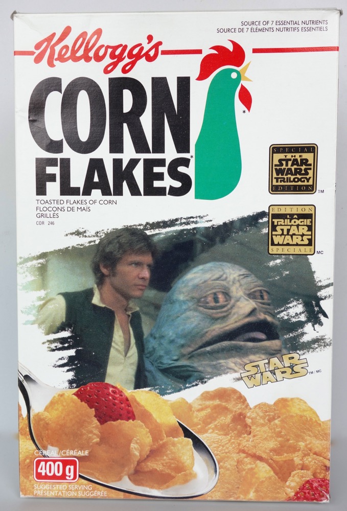 This box of Kellogg’s Corn Flakes came out in 1997, around the time of the Special Editions of the Star Wars movies, and was only released in Canada, which explains the bilingual packaging. Looking at it now just underscores how unimpressive the CGI version of Jabba was.
