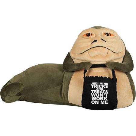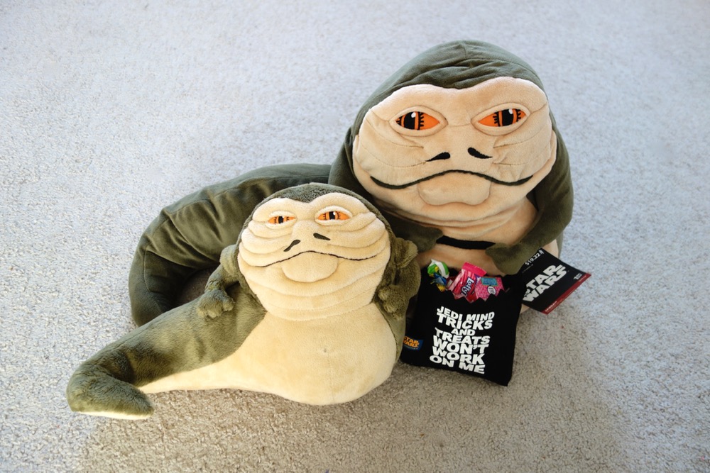 He’s got a treat bag that reads, “Jedi mind tricks and treats won’t work on me,” which is obviously a reference to Jabba’s line from Return of the Jedi about Luke’s Jedi powers not working on him. It’s cute, and a bit of an inside joke for Star Wars fans, rather than the usual easy jokes, so it gets full marks from me on that front. However, compare the photo from the Walmart website with what I got above and you’ll see that the actual item has way less stuffing in it and generally feels a bit deflated.