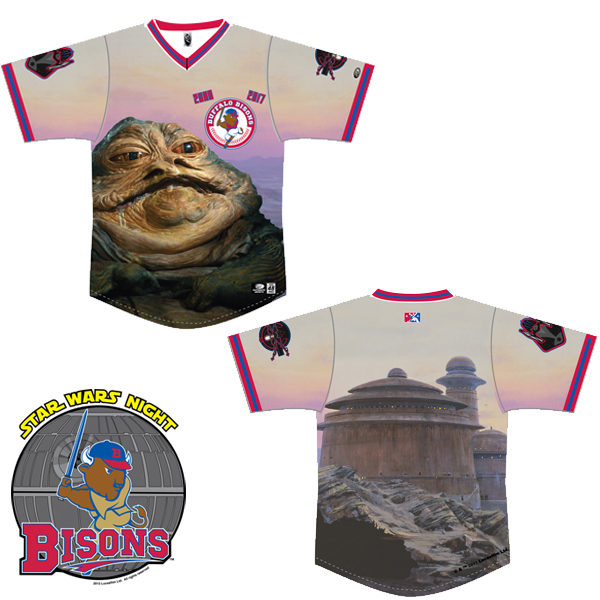 The Buffalo Bisons minor league baseball team is going to be donning Jabba-themed jerseys for their Star Wars Night event. These actually look really nice. They are auctioning off several of game-worn autographed jerseys on their site. I would love to have one of these, but I have a feeling these will go out of my price range for this kind of item. (There is a buy-it-now option for $500.)