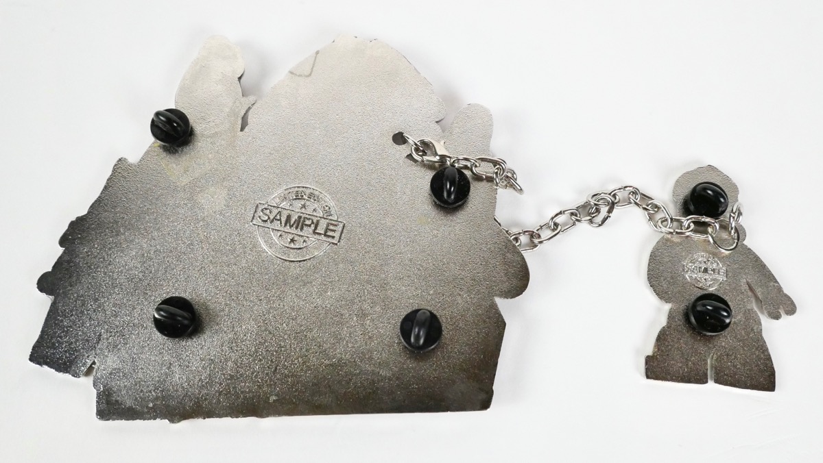 You can also see that this is marked as a “sample,” which is the other interesting thing about this pin. This particular pin is different from the ones that would have been traded, although I’m not sure if the size and coloration are different. The magenta coloration seems to indicate that this was not the final color scheme, and the fact that the same seller later put up two other color variations (pink and black & white) tends to support that idea. I’d like to see what the final version of the pin looked like, and maybe even get one (although I understand that they were not produced in very high numbers at all).