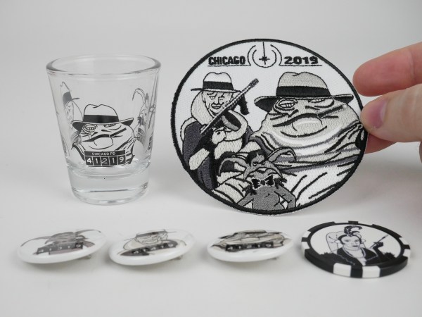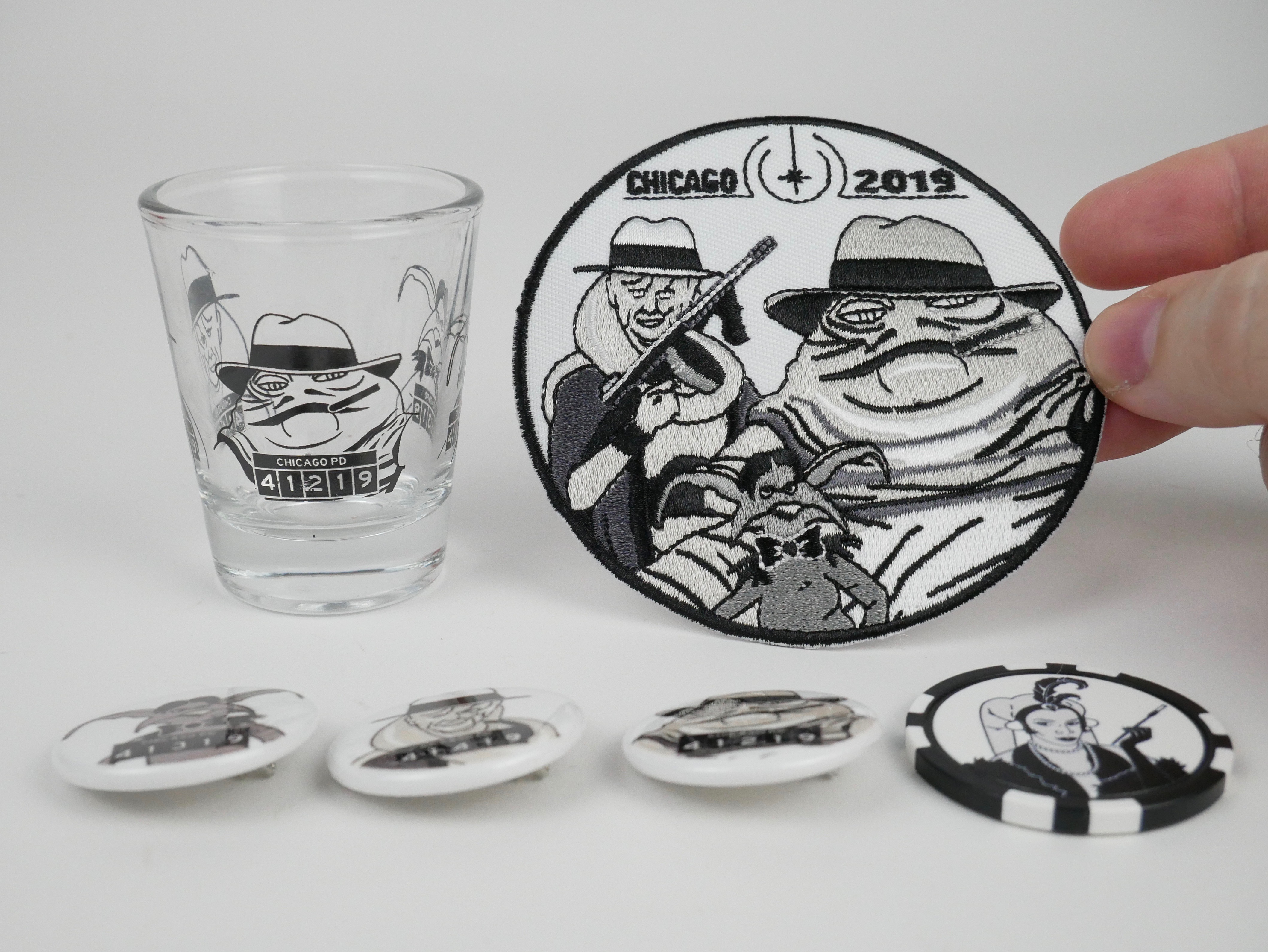 As much as I like the commercial products and exclusives that get shown off at Star Wars Celebration, the “swag” that people and companies make to give away at various events is often a lot more unique. Seven years ago (!) I posted about some swag from the 501st Legion Imperial Bash at Celebration VI, and this is in a similar vein. It consists of a shot glass, patch, and 3 buttons, all featuring artwork of Jabba the Hutt, Bib Fortuna and Salacious Crumb as 1920s-style Chicago gangsters (with the shot glass and buttons showing them as if they were in mug shots). There’s also a poker chip with Oola’s image on it that reads “Oola la!” on the back. I don’t know any specifics about who made these, or for what event, so if you know feel free to comment or shoot me an email.