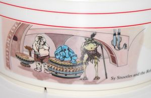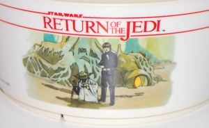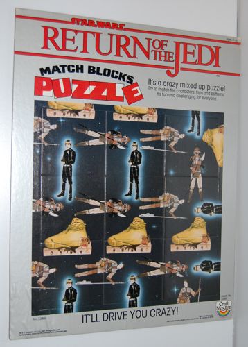 Excuse the slanty photography, but I had to take the photo from an oblique angle to avoid getting a reflection of the flash. This odd puzzle measures 11″ by 14″ and features images of Jabba, Jedi Luke, Leia as Boushh and Skiff Guard Lando. Instead of having differently shaped pieces that you fit together as with most puzzles, all of its pieces are square. The characters are mixed up in such a way that you can only complete the picture correctly using one arrangement of the pieces. But there are only nine pieces, so it’s not as if it’s all that difficult. Far from being “fun and challenging for everyone” I found it to be rather boring. Maybe small children would enjoy it more. Anyway, it’s an interesting piece that I hadn’t seen before.