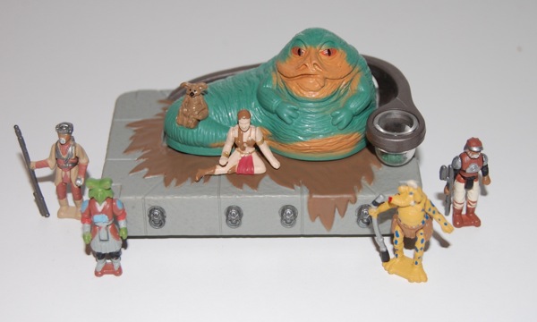 His throne actually has wheels on it, which I thought was pretty funny. I guess it would allow you to do a “wheel back to reveal the Rancor pit” move if you wanted to, or maybe you could have little throne races. 😉 There are also some froggy snacks in his bowl, which I liked.