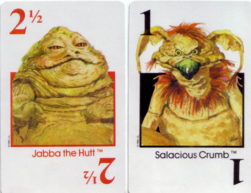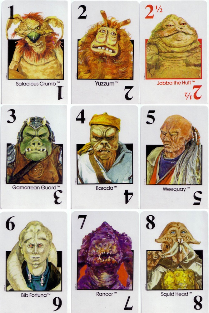 This is a set of cards that can apparently be used to play 5 different games. The box actually includes two different decks — one that features characters from Jabba’s palace and one that has characters like Yoda, Luke, and Leia. The Jabba’s palace deck is really well done with nicely painted portraits of the characters. The other deck just has some rather plain line art, so I’m just going to talk about the first deck. It has cards numbered from 1 to 8 (with Jabba at 2 1/2 for some reason). I haven’t tried playing any of the games described in the rules, but I have used them to play an improvised game of “memory” with my four-year-old. Click here for an image of the full set of 9 cards (I didn’t include the “Trap” card since it’s pretty plain).
