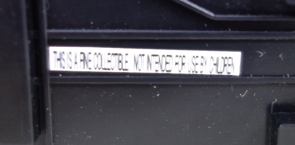 Lest you be tempted to give it to a child to play with, there is this sticker on the bottom reading, “THIS IS A FINE COLLECTIBLE. NOT INTENDED FOR USE BY CHILDREN.” Admittedly, it doesn’t seem like it would survive very long if used as a toy.