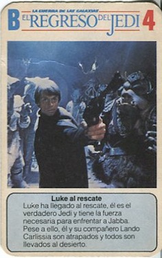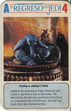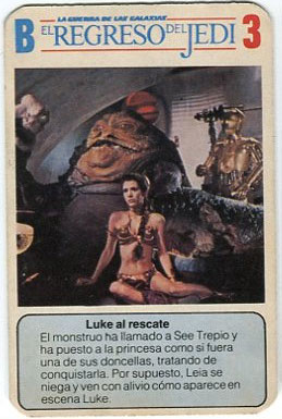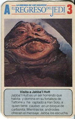 One interesting thing is that almost all of the photos on the cards are flipped horizontally from the ones we usually see. The first card below is okay, but the others are all reversed. Sometimes companies will reverse images to get them to work better in a certain context, but having so many of them reversed makes me think that they just made a mistake. One other interesting note is how they call him “Jabba’l Hutt,” which is a new variation on the name for me. I’ve seen “Jabba el Hutt” in Spanish before.