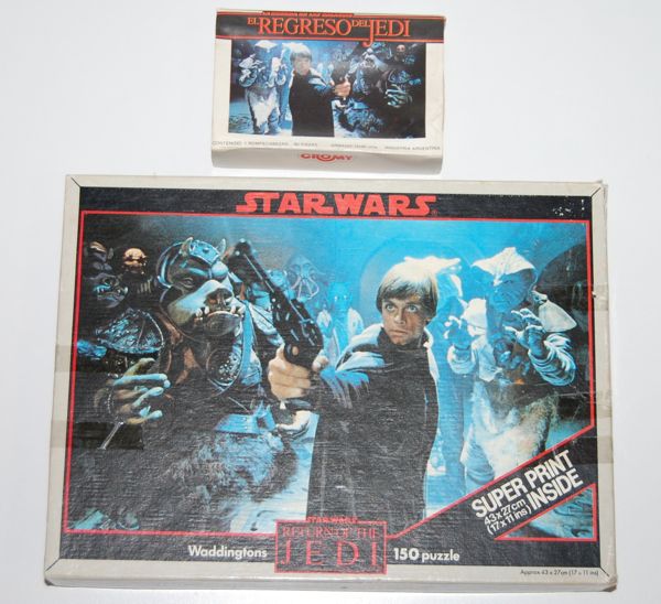 I posted about Cromy’s Return of the Jedi card game a little bit ago. This is also by Cromy of Argentina, and is actually more or less the same size as the card game. When I bought it, I had assumed it would be similar in size to the other vintage puzzles I had, like the one shown below from Waddingtons UK. So I was surprised that it’s the size of a pack of cards or an audiotape box, but I actually like this better.