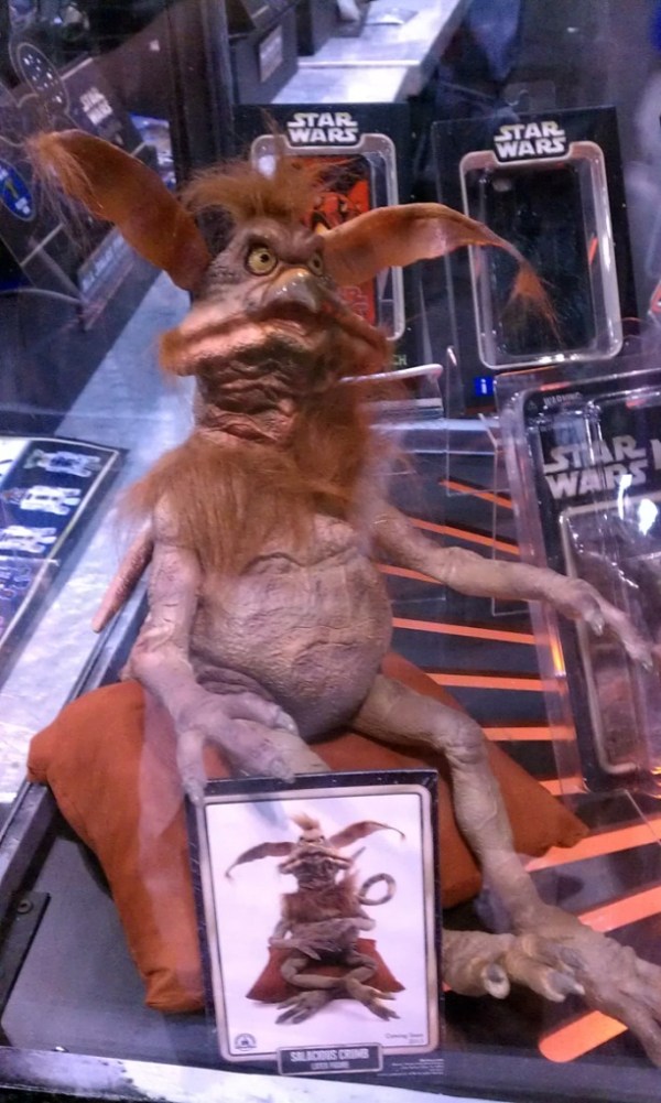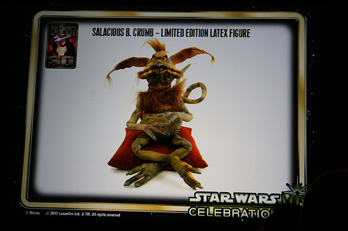 Finally, and perhaps most intriguing of all, is this latex Salacious Crumb figure. I know they made a latex Yoda figure that was around 18″ tall and cost about $40. Someone who saw the actual Salacious at Celebration said he thought it was more like 13″ tall, but that’s probably sitting down. In any case, I’ll definitely have to keep an eye out for this one. It sounds like it will be posable, which should open up possibilities for costumes, jokes, etc. Here’s a shot of it that Shropt from the Sideshow Freaks board posted. I’d say the likeness looks a little bit off, but it might just be the paint.