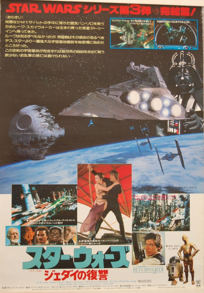 If I seem to be writing about a lot of posters recently, it’s because I finally dug out my backlog of posters and took pictures of them. I was kind of excited to get this one, as I am a Japanese translator and feel a sort of connection to things from Japan. I’ll have to say, though, that as a poster this is kind of a mess. It’s just a jumble of publicity photos that aren’t even really arranged very well. And what’s with the gigantic Darth Vader standing there behind the planet? Kind of odd. It’s also very text-heavy for a movie poster, with captions under all of the photos, plus a Japanese version of the movie’s opening crawl in the upper left.