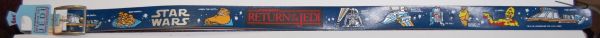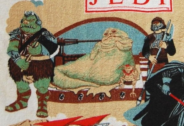 The Jabba illustration they used is basically the same as the one on the other towel, but it has been drawn and colored in a rather different style. Many of the other illustrations are more or less identical to the ones Bibb used on their sheet set, but the Jabba on the sheets is completely different for some reason. Given their size, these towels are pretty difficult to display, but I’ve been folding them over a piece of cardboard and displaying just part of the art as a background to some of my display shelves.