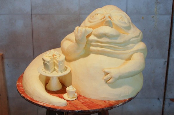 This isn’t new (the pictures are dated 2009) but I just found out about it. How awesome is this butter sculpture of Jabba the Hutt eating a piece of cake? I’d love to have a version of it in a more permanent medium. Click through to her site for more pictures.