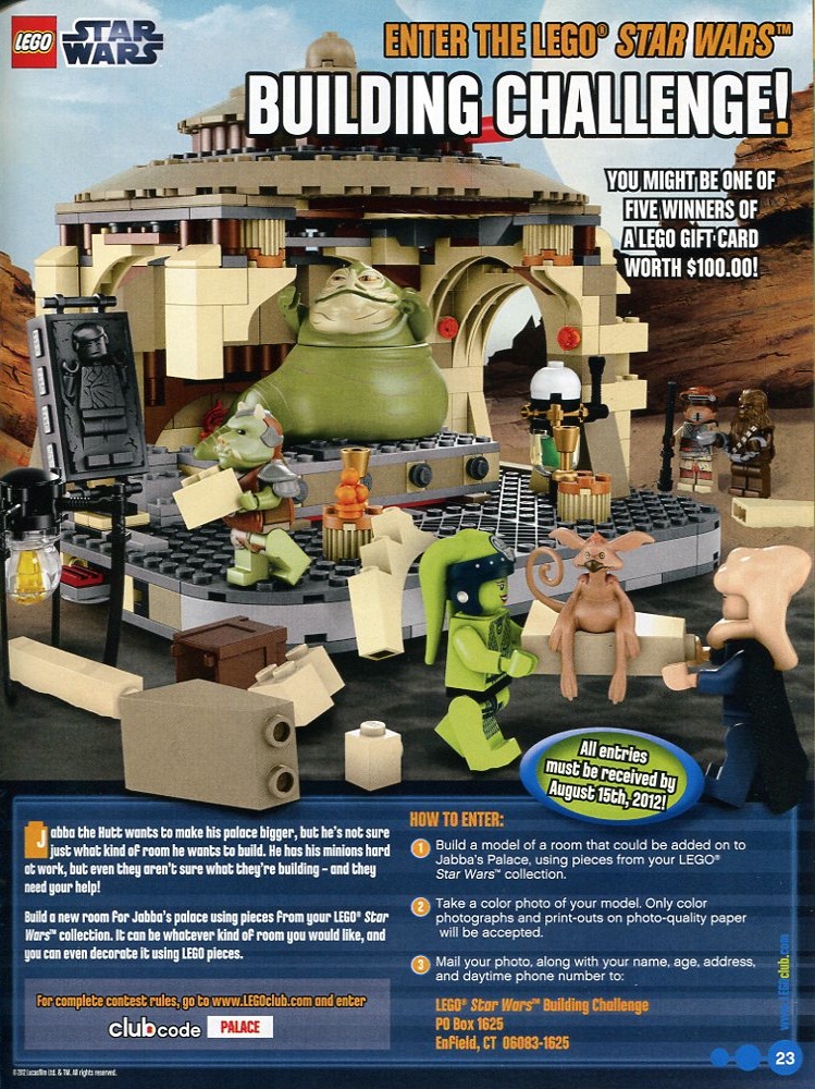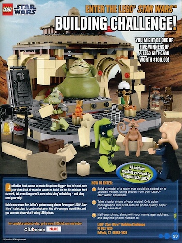 My son just got the latest edition of LEGO Club Magazine (essentially a glorified LEGO ad, but it has some comics and activities as well). I was interested to see that they are running a contest in which kids can design a room to add on to the new LEGO Jabba’s Palace using Star Wars LEGOs. Five winners will get $100 LEGO gift cards. I’m trying to convince my son to enter. 🙂 I tried accessing the LEGO Club website for more info (you’re supposed to enter the club code “palace”) but it didn’t seem to work. Maybe it’s not active yet. Click the image for a bigger version.
