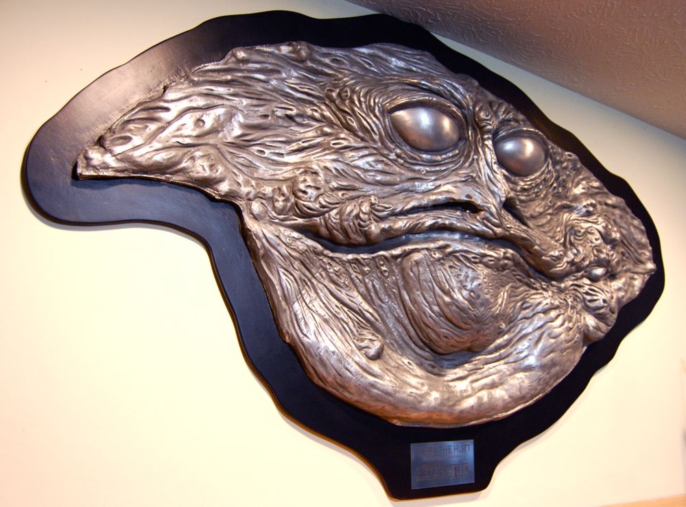 This is a bust (or more accurately, a wall hanging) made by John Coppinger, who sculpted the original Jabba the Hutt puppet. The original puppet was scrapped a while after Return of the Jedi ended. This always seemed strange to me, since Lucasfilm keeps a lot of stuff for its archives. But according to John, parts of Jabba’s latex skin were already deteriorating even then — mostly the parts that touched the throne. So maybe this decay along with the huge unwieldy size of the puppet made them decide to scrap it. In any case, John had the foresight to save one latex test casting from the original sculpt — a skin just like they used in the film, but unpainted.