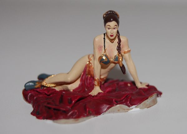 The palace model came with Jabba, and the barge comes with Slave Leia. She looks pretty terrible in the picture here, but keep in mind that she’s only about an inch long, so in person she looks okay. They seem to have taken the pose directly from the Gentle Giant Slave Leia statue (which I don’t have yet). She’s more or less in scale with the Jabba that came with the palace, as you can see below. Click for a larger view.